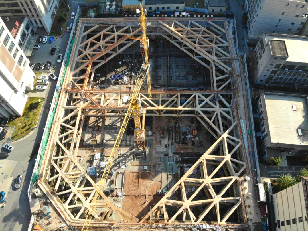 项目地处医院内部,施工环境复杂——场地狭小、周边建筑密集、地下管线错综,且基坑深、地下水丰富,对支护安全与防渗漏要求极高。面对上述挑战,项目充分发挥临时党支部引领作用,聚焦EPC联合体优势,联合设计、监测单位研读地勘资料及规范,识别风险源并拟定专项方案;同时邀请专家及建设、监理单位,围绕支护设计、深基坑施工等关键环节多轮论证,攻克技术难题。