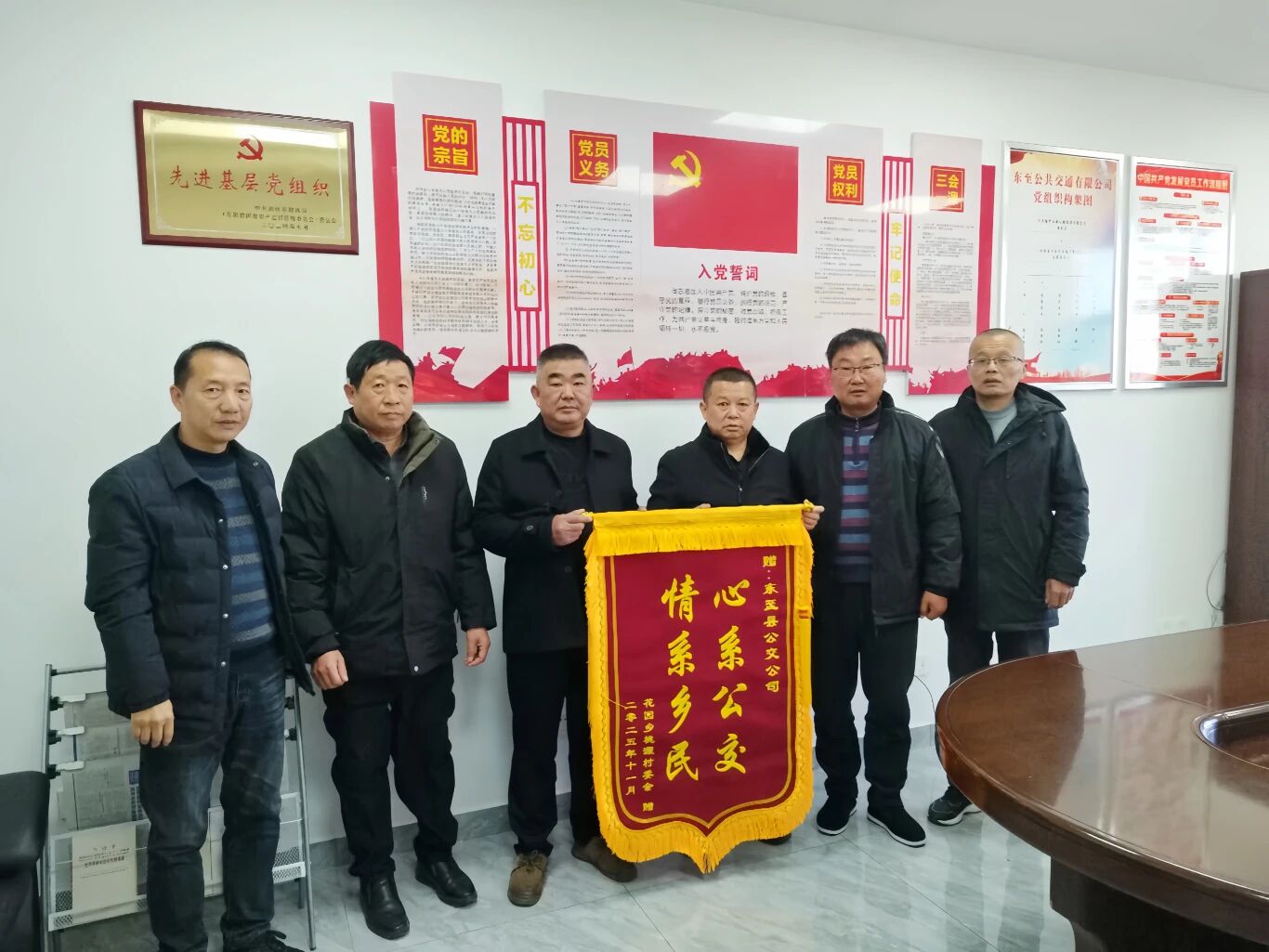 2025年11月25日上午,安徽省池州市东至县花园乡桃源村委会支书一行专程来到东至公交公司,送上了一面印有“心系公交 情系乡民”的锦旗,以此表达对公司多年来坚持运营县城至桃源村公交线路的诚挚谢意。