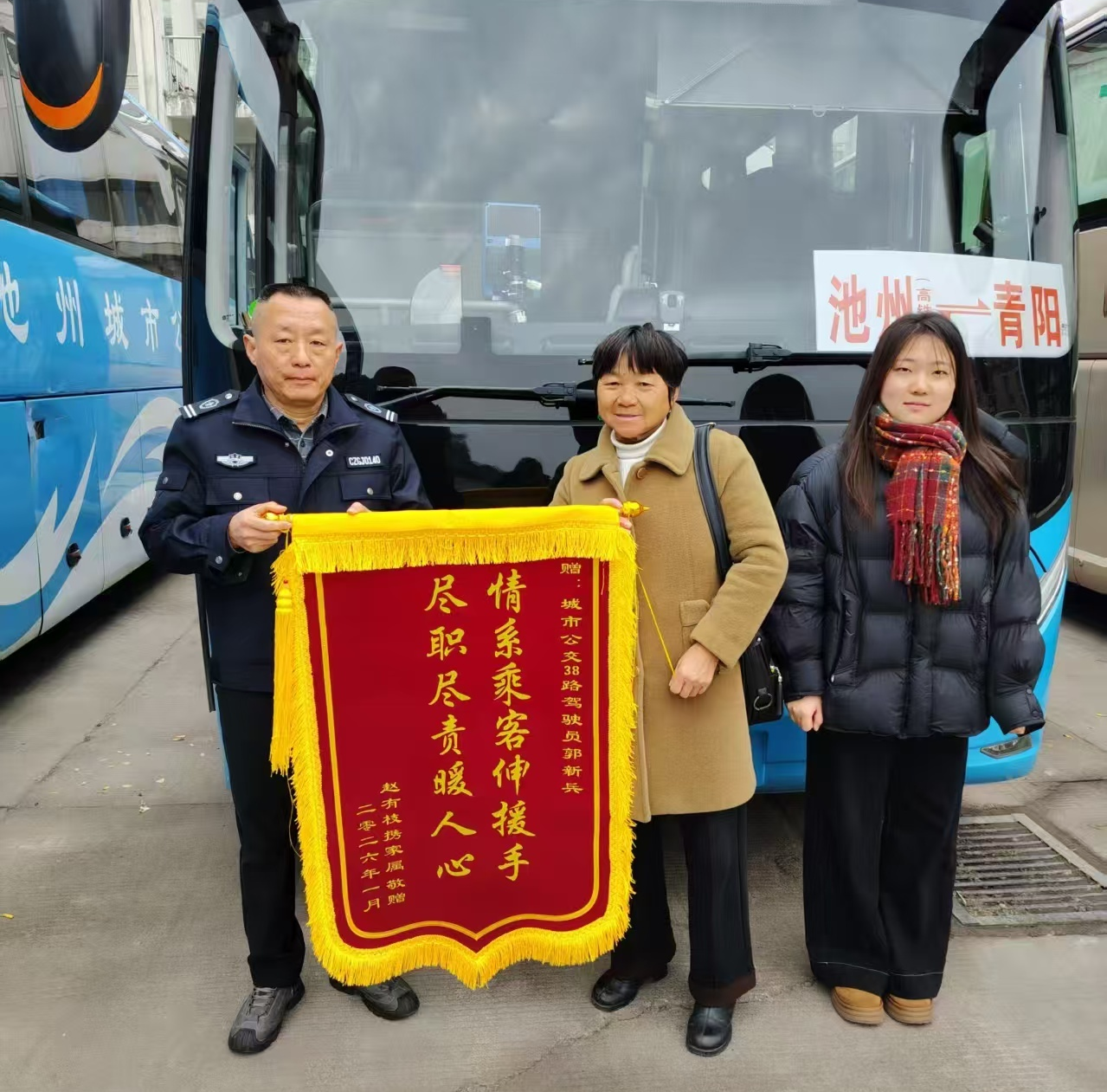 2026年1月14日下午,38路驾驶员郭新兵如往常一样执行从火车站开往青阳汽车中心站的班次。行驶至马衙中学附近时,车厢内传来乘客急切的求助声——一名中年女乘客突发身体不适。郭师傅当即判断需立即寻求专业帮助,第一时间驾车前往附近的马衙派出所,同时向公司安全部报备情况,并紧急拨打120急救电话。郭师傅全程陪同,积极配合现场民警工作,直至医护人员完成检查。万幸的是,经医护人员初步诊断,乘客身体已趋于稳定,无需进一步就医。妥善安置好乘客、确认无异常后,郭师傅才重新启动车辆,恢复正常运营,全程未耽误其他乘客的出行。